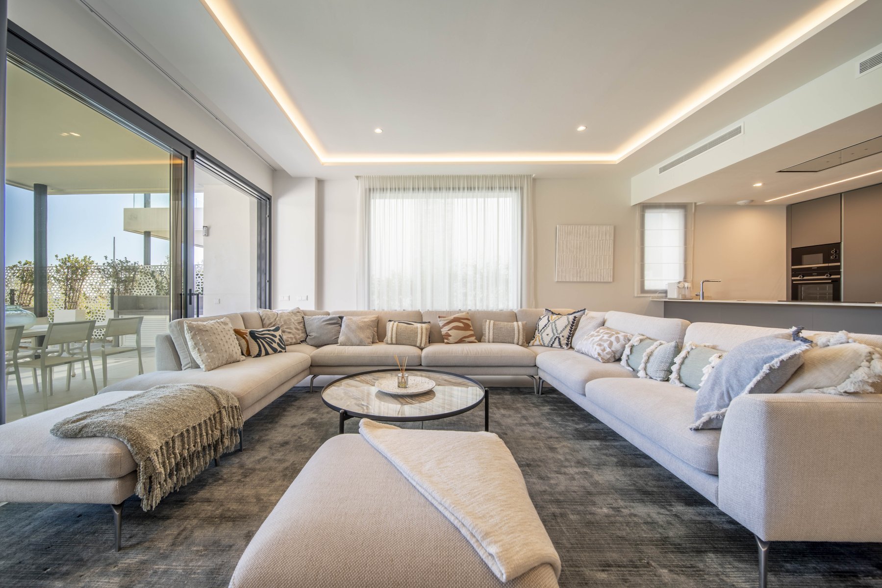 Velkorysý open-space obývací prostor s přímým vstupem na terasu