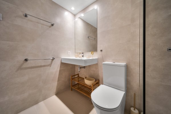 Apartmán se skládá ze dvou komfortních ložnic, které poskytují dostatek soukromí a prostoru až pro 4 osoby. K dispozici jsou dvě moderně vybavené koupelny. Centrem apartmánu je stylový obývací pokoj propojený s jídelní částí, ideální pro společné trávení času. Plně vybavená kuchyň nabízí vše potřebné– od kuchyňského náčiní, přes spotřebiče až po dostatek úložného prostoru.